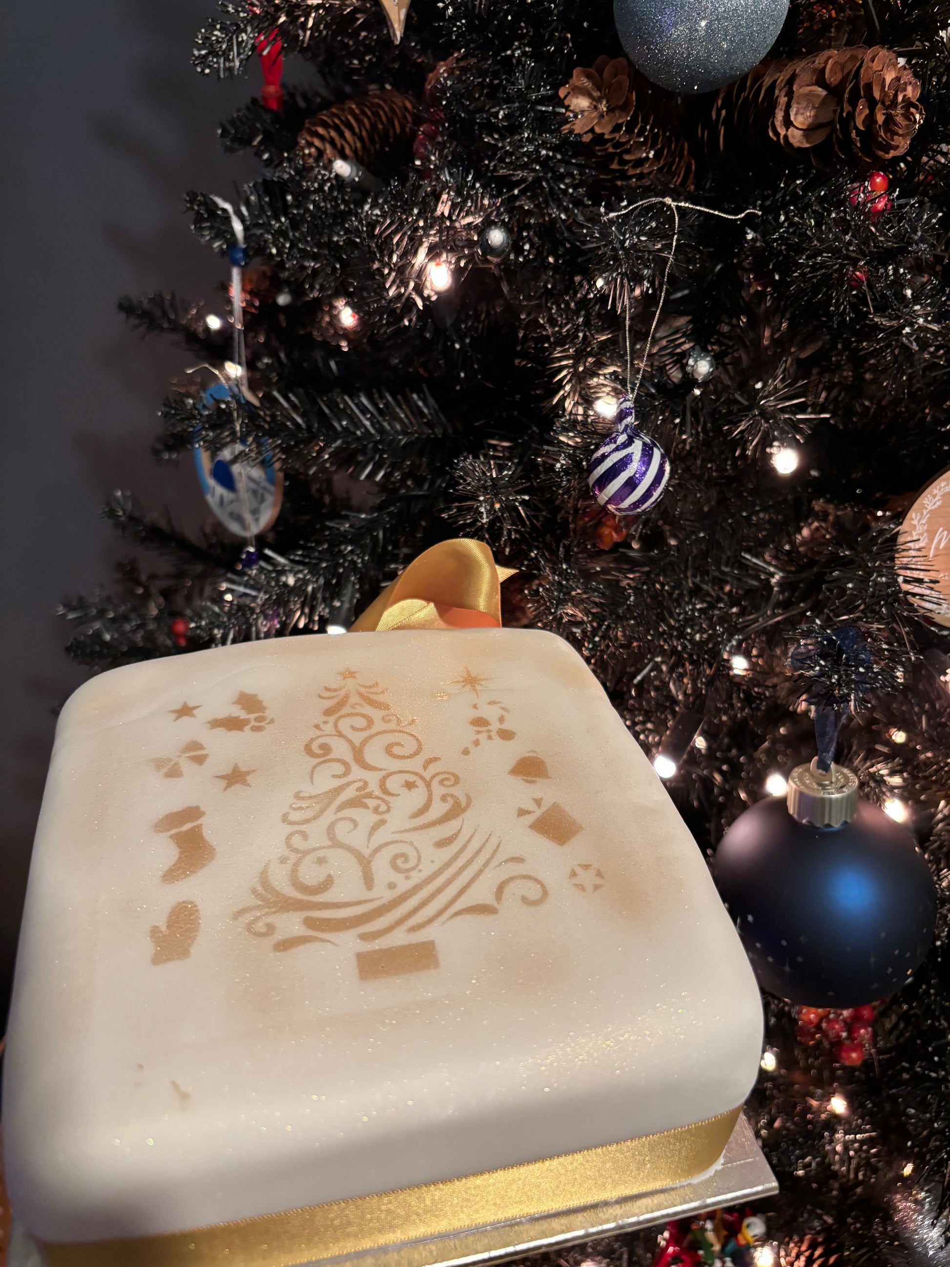 🎄 6 inch square brandy soaked fruit cake, covered with marzipan & white icing covering all the sides and top, with a ribbon & decorated with a festive airbrush design.
