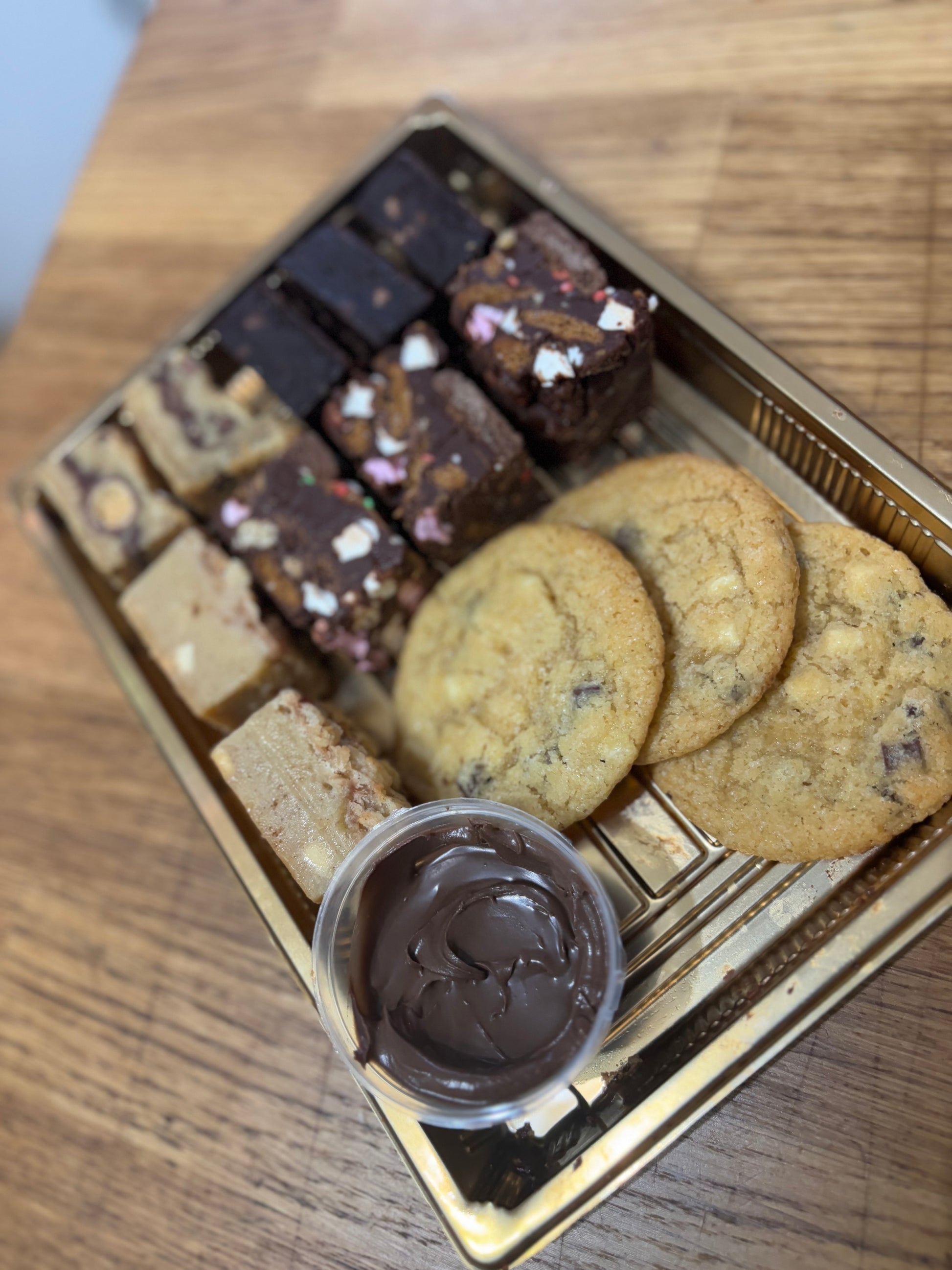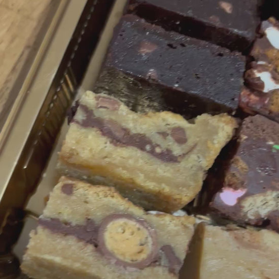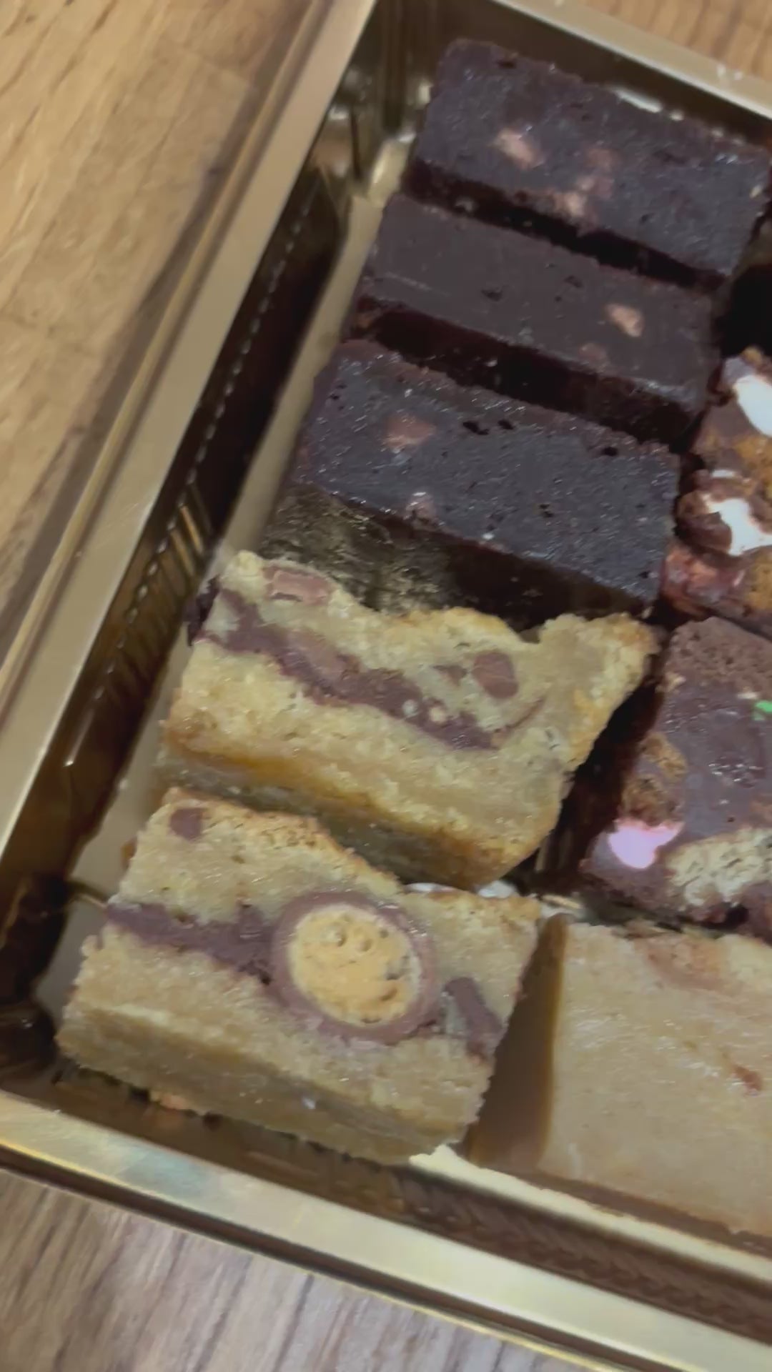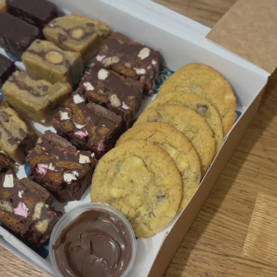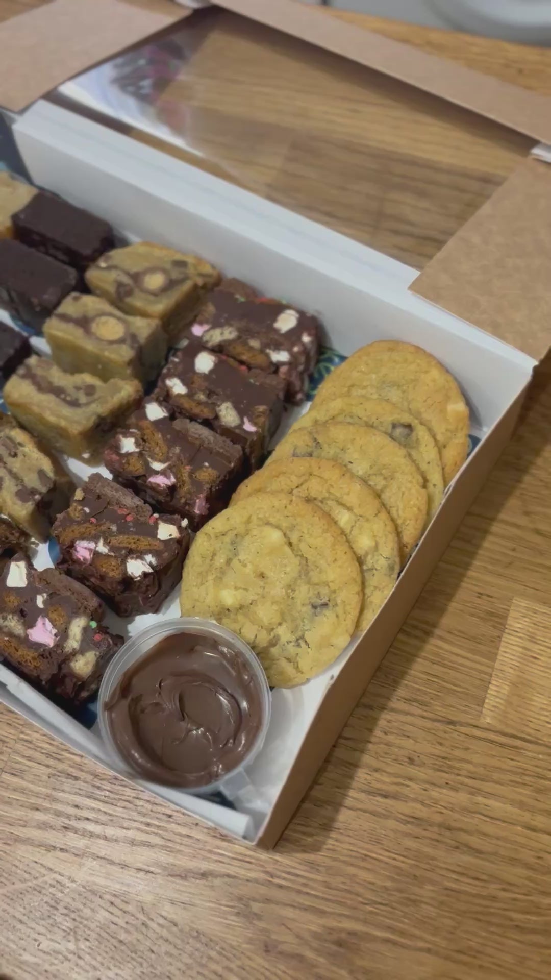 Each box has a mix of my Chocolate orange brownie, Local apple crumble blondie, Malteser stuffed cookie bar, Biscoff rocky road & Mini double chocolate cookies with a milk chocolate dip.